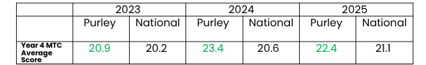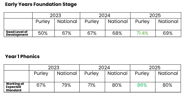 The tables below show how Purley’s results compare with the national average. With our small class sizes (6–7 children in recent Reception and Year 1 cohorts, and a maximum of 15 children in KS2 cohorts), each child’s results have a greater impact on overall percentages.